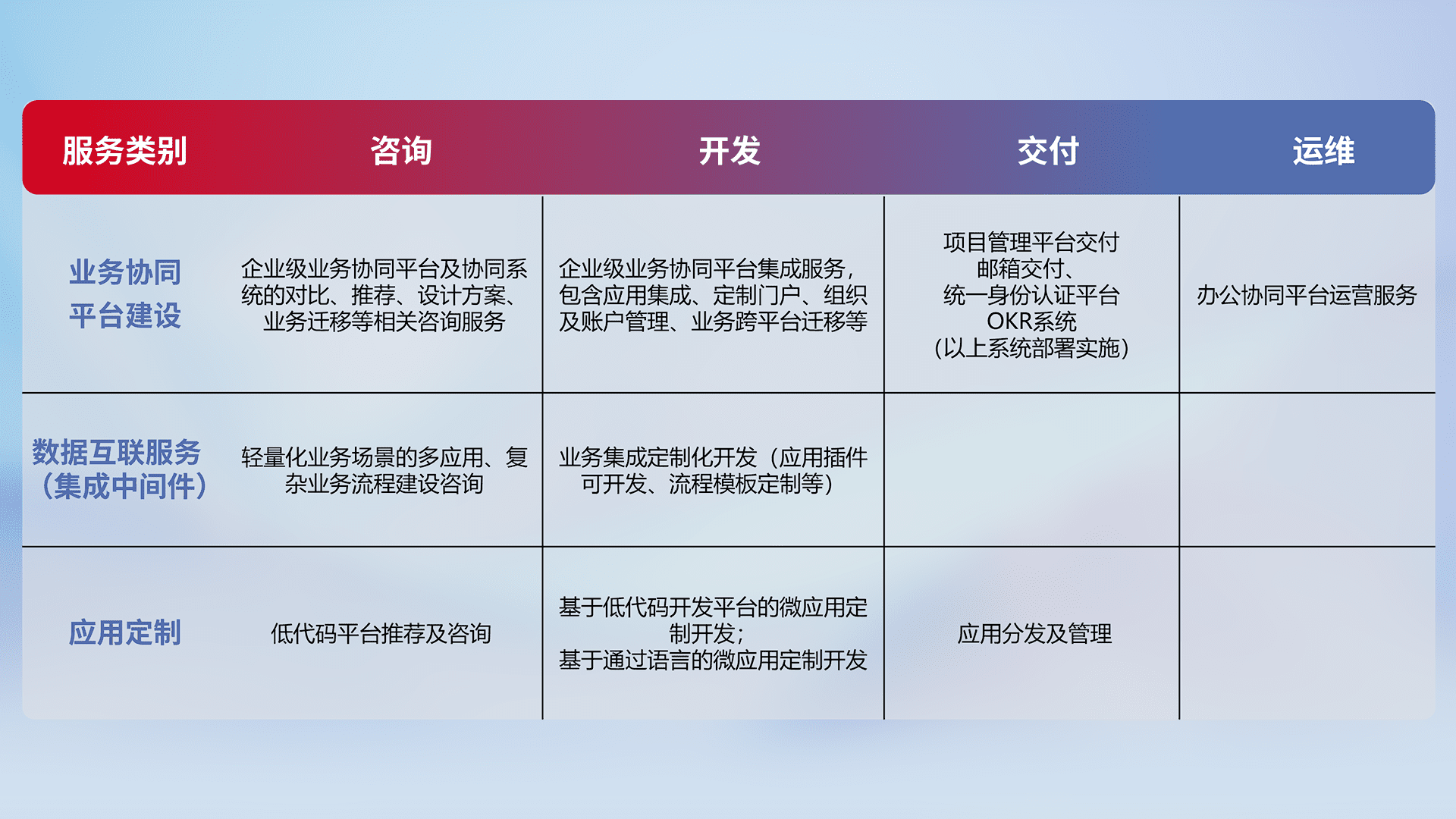 针对钉钉、、、、企微、、IDaas等平台级产品提供产品的规划、、、方案、、、、交付、、、、定制化开发等服务,,,,实现如统一协同办公、、、智能客户服务、、、混合会议管理、、智能数据查询、、、、等业务场景,,,实现数字化转型。。。